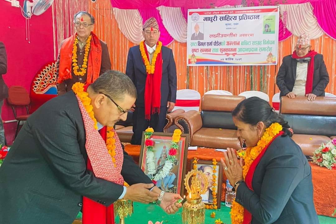 उक्त कार्यक्रममा लेखक संघ पर्वतका अध्यक्ष ओमप्रसाद घायल,शिक्षक संघ पर्वतका उपाध्यक्ष गोविन्द पोखरेल,शिवालय क्याम्पसका प्रमुख लेखनाथ उपाध्याय ,नारायण माविका पूर्वप्रधानाध्यापक पृथ्वीनारायण शर्मा,कुस्मा नगरपालिका ९ का वडाध्यक्ष रामशर्मा लामिछाने लगायतले बोल्दै विमल शर्मा पौडेलको कृति अम्लान बाछिटासङ्ग्रहको चर्चा गरेका थिए । माधुरी साहित्य प्रतिष्ठान कुस्माको आयोजनामा भएको उक्त कार्यक्रममा साहित्यकार भवानीशंकर पौडेल र लक्ष्मीराज पौडेललाई साहित्यमा पु¥याएको योग्दान वापत सम्मान गरिएको हो । भने,गुरुङ चलचित्रका नायक तारा गुरुङद्धारा नेपाली राष्ट्रिय टोपीको महत्वलाई नाट्यकलामा प्रर्दशन गरिएको थियो ।