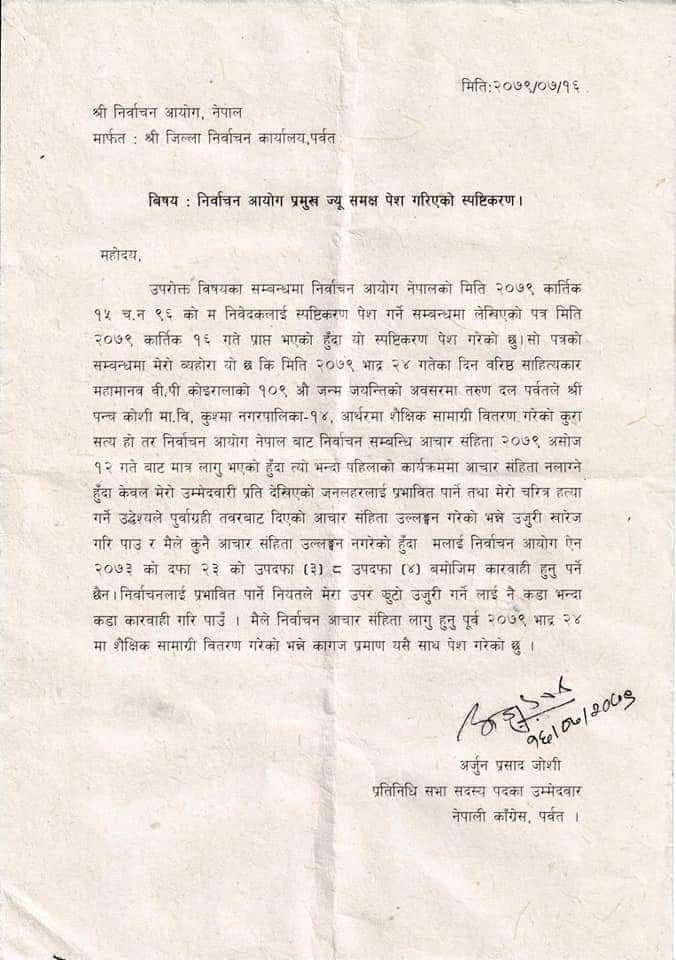 पर्वत/निर्वाचन आयोगले पर्वतका प्रतिनिधिसभाका उम्मेदवार अर्जुनप्रसाद जोशीसंग आचारसंहिता लागु हुनुभन्दा एकमहिना अगाडीको मितिको कार्यक्रमका बारेमा स्पष्टिकरण सोधेको पाईएको छ । मंसिर ४ मा हुने प्रतिनिधीसभा र प्रदेशसभा निर्वाचनको आचारसंहिता लागु भन्दा असोज १२ गतेबाट लागु भएको थियो । तर आयोगले जोशीलाई आर्थरडाँडाखर्कमा २०७९ भदौ २४ गते पञ्चकोशी माविका विद्यार्थीलाई शैक्षिक सामाग्री वितरण गरेकोमा स्पष्टिकरण सोधेको हो ।