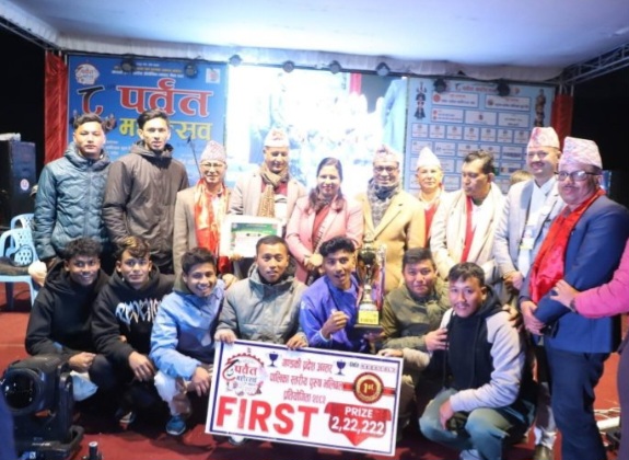 पर्वत उधोग वाणिज्य संघको स्वर्ण जयन्तिको अवसरमा आयोजित गण्डकी प्रदेश स्तरीय औधोगिक व्यापार मेला तथा आठौ पर्बत महोत्सबमा आयोजित गण्डकी प्रदेश अन्तरपालिका स्तरिय पुरुष भलिबल प्रतियोगिताको आज भएको फाईनलखेल निकै रोचक र प्रतिस्पर्धा भएको थियो । प्रतियोगितामा कुश्मा नगरपालिका तृतीय र फलेवास नगरपालिका सान्त्वना भएका छन् ।तृतीय र सान्त्वना हुनेले क्रमशः नगद ५५,५५५ (पचपन्न हजार पाँचसय पचपन्न रुपयाँ) सिल्ड मेडल र प्रमाणपत्र र सान्त्वना टिमलाई पनि २२,२२२ (बाईस हजार दुईसय बाईस रुपयाँ) सिल्ड मेडल र प्रमाणपत्र प्राप्त गरेका छन् । पर्वत सदरमुकाम कुस्माबजारको बडागाउँमा सम्पन्न प्रतियोगितामा करिब १ लाख दर्शकले अवलोकन गरेका छन् । महोत्सव समापन भएसँगै स्टलहरु र बाल उद्दान सँगै स्टेज उठाउने काम भैरहेको मुल संयोजक तथा पर्वत उद्योग बाणिज्य संघका अध्यक्ष ठाकुर वि पौडेलले जानकारी दिनुभयो । यसपालिको महोत्सवमा विशेष गरी स्थानिय उद्योगी, व्यवसायीलाई प्राथमिकता दिएर कृषि, उद्योग, पर्यटन, व्यापार ,व्यावसाय,कला, संस्कृती र साना तथा मझौला उद्दोेग व्यावसायी लाई प्रमोट गरिएको उहाँले बताउनुभयो ।